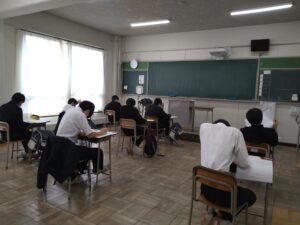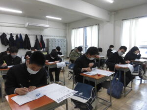 本日冬休み明けテストを実施しています。出題範囲は冬休みの宿題。しっかり取り組んできたでしょうか? 写真は中2、3校時英語の様子です。
