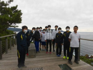 地域学習「三陸ジオパーク南エリアの観光ルートを作ろう」。今日は、自分たちが考えたルートの一部を実際訪れてきました。 大船渡グループ。全員で碁石海岸へ。 このあと、班ごとに研修をスタートさせました。